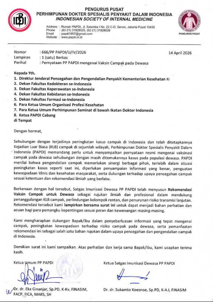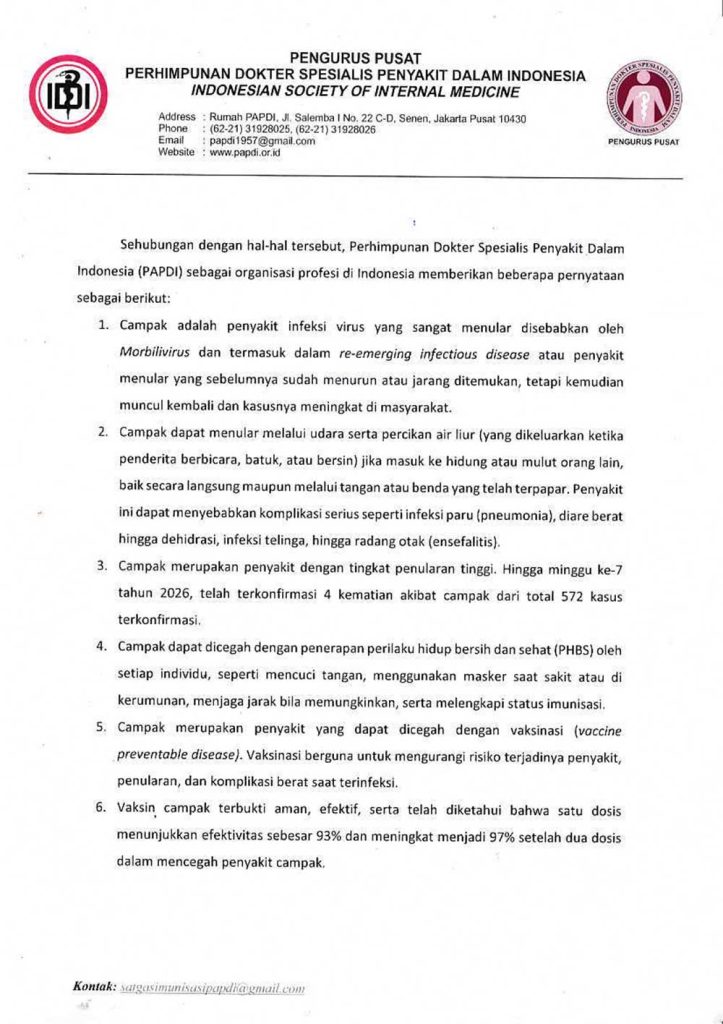 Sehubungan dengan terjadinya peningkatan kasus campak di Indonesia dan telah ditetapkannya Kejadian Luar Biasa (KLB) campak di sejumlah wilayah, Perhimpunan Dokter Spesialis Penyakit Dalam Indonesia (PAPDI) memandang perlu untuk menyampaikan pernyataan resmi mengenai vaksinasi campak pada dewasa sehubungan dengan masih ditemukannya kasus pada populasi dewasa. PAPDI menilai bahwa pengendalian campak memerlukan sinergi berbagai pihak, terlebih dalam situasi peningkatan kasus seperti saat ini, diperlukan penyampaian informasi yang benar, penguatan kewaspadaan klinis dan kesehatan masyarakat, serta dukungan terhadap upaya pencegahan campak sesuai ketentuan dan rekomendasi ilmiah yang berlaku.