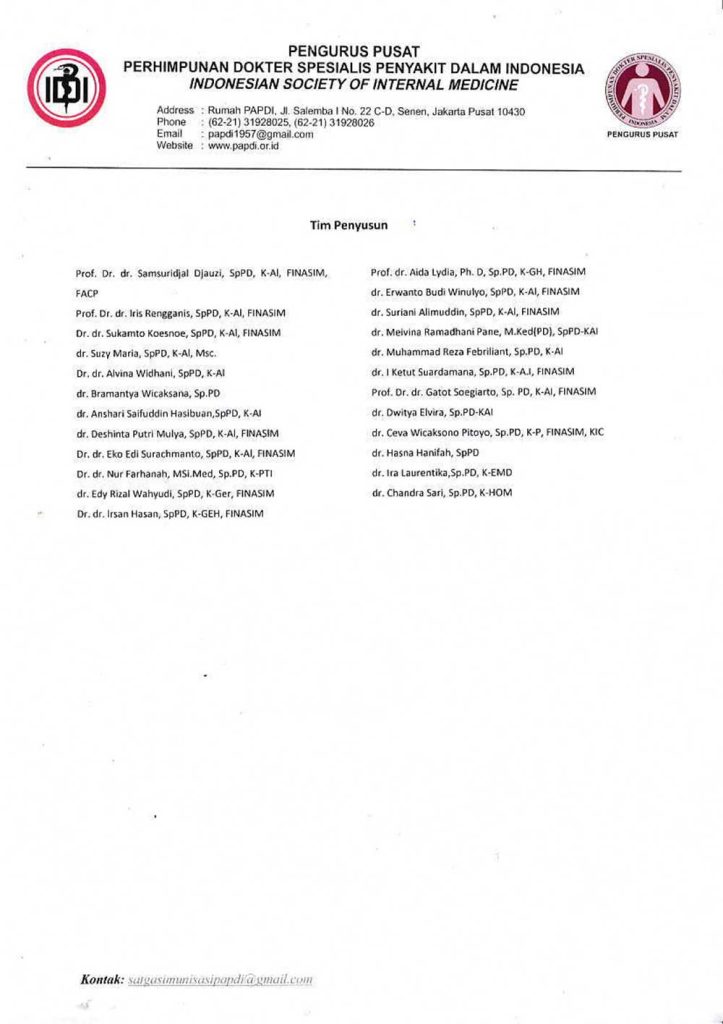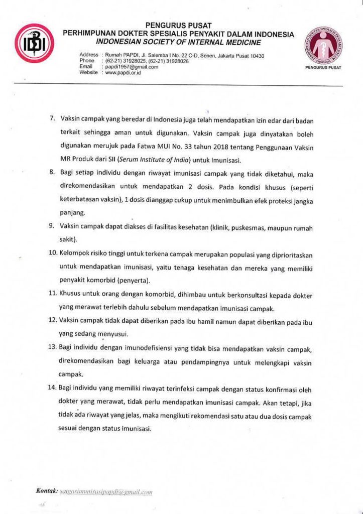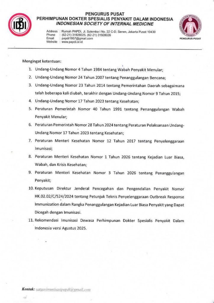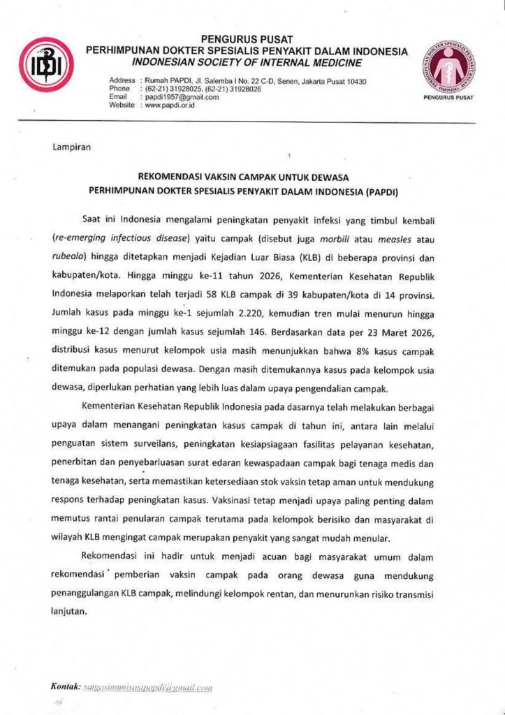Berkenaan dengan hal tersebut, Satgas Imunisasi Dewasa PP PAPDI telah menyusun Rekomendasi Vaksin Campak untuk Dewasa sebagai rujukan ilmiah dan profesional dalam mendukung penanggulangan KLB campak, perlindungan kelompok rentan, dan penurunan risiko transmisi lanjutan. Rekomendasi tersebut kami lampirkan bersama surat ini untuk dapat menjadi bahan perhatian dan acuan bagi para pemangku kepentingan sesuai peran dan kewenangan masing-masing.